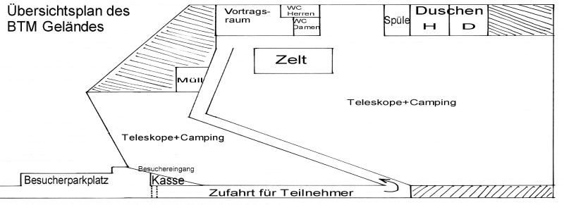 Was bietet ein Teleskoptreffen?Teleskope aller Bauarten im direkten Vergleich * sämtliches Astro-Zubehör im Einsatz * Selbstbaugeräte * Astro-Literatur * EDV und CCD-Technik * Vorträge und Informationen * Präsentationen von Vereinen * vielseitige Kauf- und Verkaufsmöglichkeiten (Astrobasar) * Erfahrungs- und Gedankenaustausch * Verpflegung (Getränke) * geselliges Beisammensein