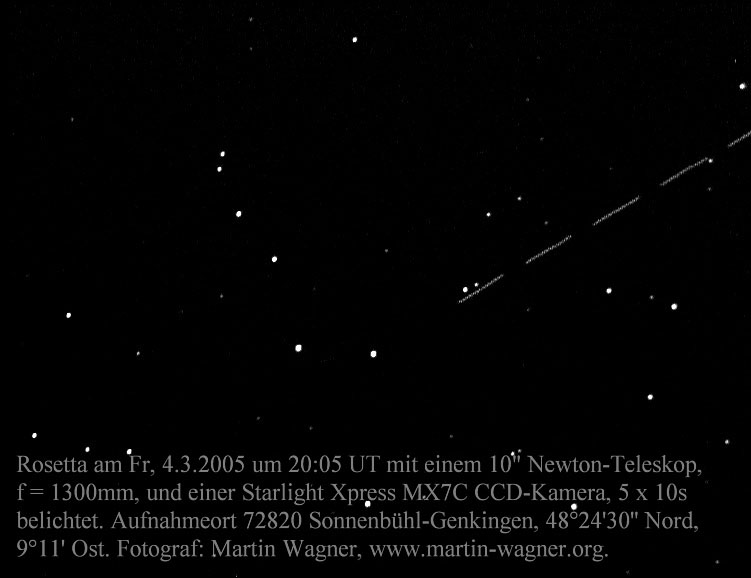 Ein recht seltenes Himmelsschauspiel ereignet sich in den frühen Abendstunden des 4. März, wenn nämlich die kleine Raumsonde Rosetta in einem Fly-by-Manöver die Erde passiert. Die Raumsonde ist unterwegs zum Kometen 67P/Churyumov-Gerasimenko, den sie 2014 erreichen wird (wir werden eventuell Berichten ;-) ) und muß dafür Schwung holen. Es wird dafür die Massenanziehungskraft der Erde benutzt, um den kleinen Satelliten genügend Geschwindigkeit zu verschaffen.